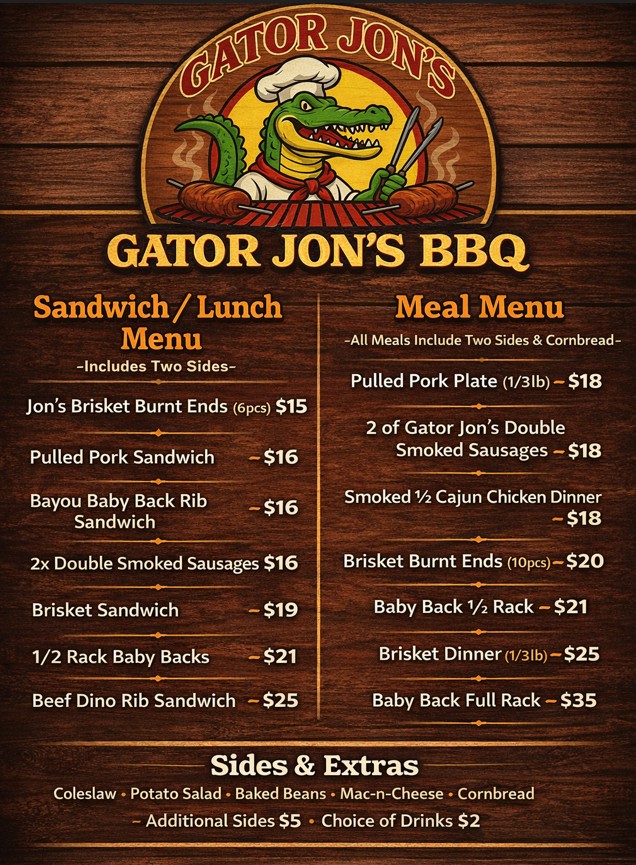 Welcome to Gator Jon's BBQ Stand Located in the Kelly's Country Store Lot The Best BBQ On Grand Island 3121 Grand Island Blvd, Grand Island NY, 14072Truck Re-Opens April 15th! Our Menu Catering Our Menu We Sell Out Daily! The sooner you stop in, the better chance we have of completing your order. Follow us on Facebook for daily updates. Facebook About Jon's Catering Testimonials Merch Ready to come visit? Contact us today We’re pumped to see you, so grab your crew and come hang with us! Good food, cold drinks, and even better company with yours truly. Contact Us
